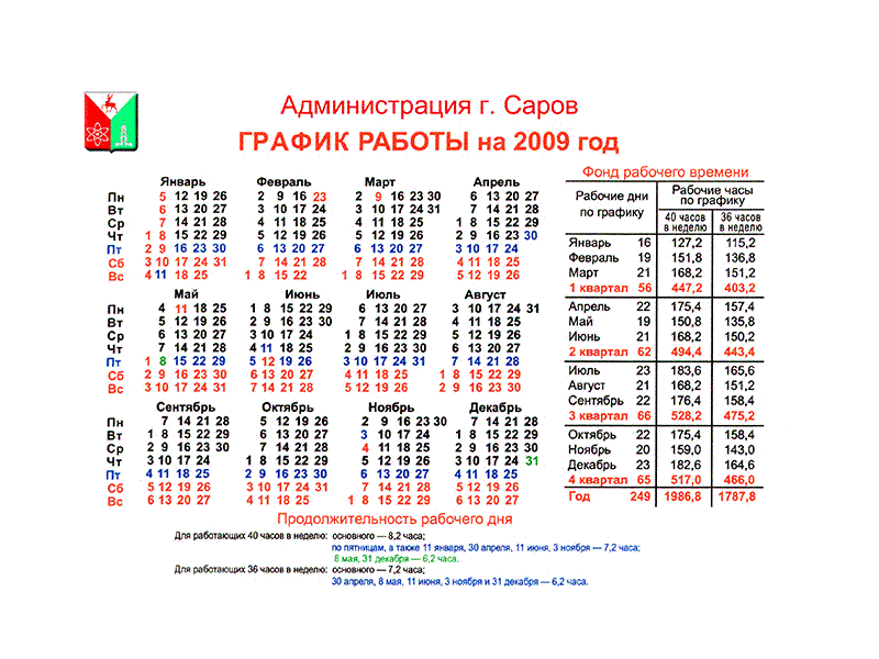 ![]() Понедельники взять и отменить20 декабря 2008, 15:37 Администрацией города Саров опубликован график работы на будущий год. В «женский» и «мужской» праздники будем отдыхать по понедельникам! Об этом сообщил сайт adm.sarov.ru. В установленном графике работы администрации на 2009 год выходными объявлены 1-10 января, 23 февраля и 9 марта, 1 и 11 мая, 12 июня и 4 ноября. Работать придется дополнительно 11 января, в воскресенье. Сокращенными днями помимо пятниц будут 11 января, 30 апреля, 8 мая, 11 июня, 3 ноября и 31 декабря. ![]() Комментарии